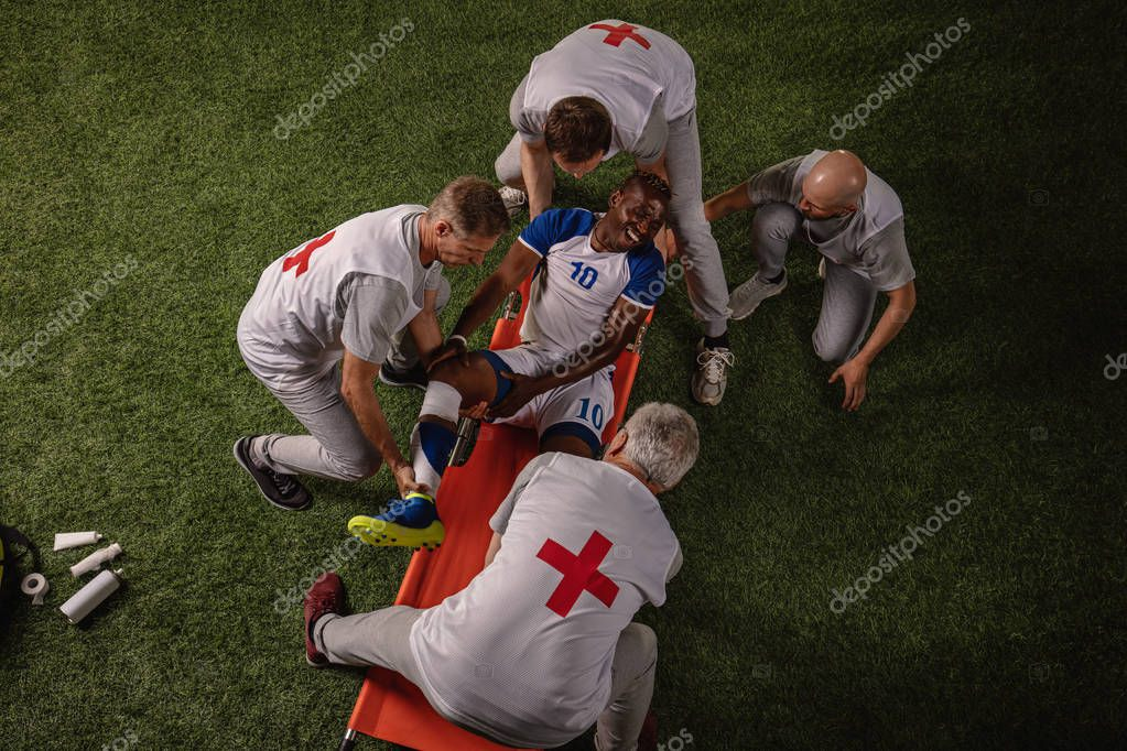 Fuente: https://www.deperu.com/imagenes/273791906-jugador-de-futbol-lesionado-pierna-durante-el-juego-los-medicos-deportivos-proporcionan-primeros-auxilios-al-jugador-en-un-campo-de-futbol-profesional.html