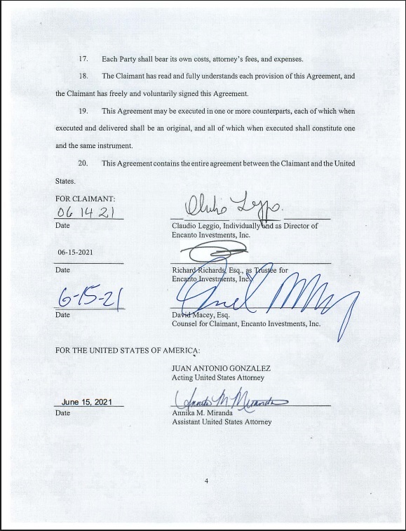 Según el documento oficial del Departamento de Justicia de los Estados Unidos, titulado ‘Stipulation and Settlement Agreement’ (Acuerdo de Estipulación y Arreglo), firmado en junio de 2021, el caso se resolvió de manera extrajudicial sin recurrir a litigios innecesarios. El acuerdo establece que las partes (EEUU y Encanto Investments, Inc., empresa vinculada a la familia Leggio) acordaron resolver el asunto “consistente con la política de buena fe que favorece el arreglo de disputas legales sin recurrir a litigios innecesarios”. Esto confirma que no existió ningún procedimiento penal o ‘secuestro’ en el sentido criminal, sino una retención cautelar administrativa temporal por irregularidades regulatorias.