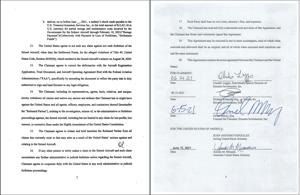 Una vez cumplidas estas obligaciones, el Gobierno de los Estados Unidos devolvió inmediatamente la aeronave y dio por terminado el expediente de forma definitiva, sin iniciar ninguna acción adicional de decomiso. El acuerdo también incluyó que el fideicomiso renunciaba a cualquier reclamo presente o futuro contra el Gobierno estadounidense, sus agentes, empleados o contratistas relacionados con la retención o el procedimiento. Además, se obligó a corregir los documentos de registro del avión ante la Administración Federal de Aviación (FAA) y a cooperar en caso de eventuales reclamos de terceros. Cada parte asumió sus propios costos y honorarios.