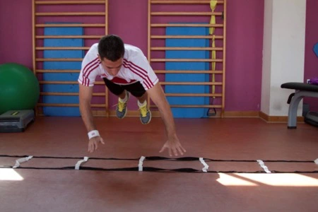 Descripción: Utiliza una escalera de agilidad en el suelo. Realiza diferentes patrones de pies (un pie por cuadro, dos pies por cuadro, zig-zag, entrada y salida lateral) a máxima velocidad.