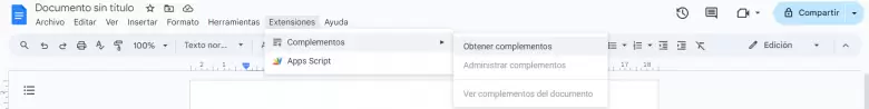 2. Hac click enExtensiones -> Complementos -> Obtener complementos.