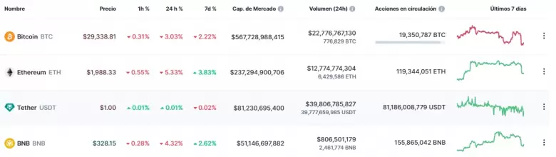 La criptomoneda de mayor volumen cay alrededor del 3% en las ltimas 24 horas y cotizaba US$ 29.338.81, de acuerdo al portal Coinmarketcap. El mnimo alcanzado en la jornada fue de US$ 29.100.