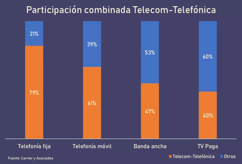 - Como consecuencia, las participaciones de mercado combinadas de ambas empresas son: 61% en telefona mvil, 47% en banda ancha, 40% en TV paga y 79% en telefona fija.