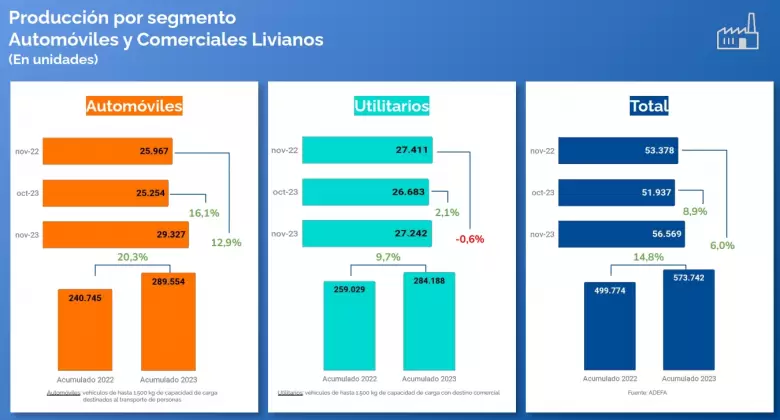 En el acumulado de enero a noviembre, las terminales produjeron 573.742 vehculos de pasajeros y utilitarios, es decir, registr un incremento de 14,8% respecto del volumen que se fabric en el mismo perodo de 2022, que fue de 499.774 unidades.