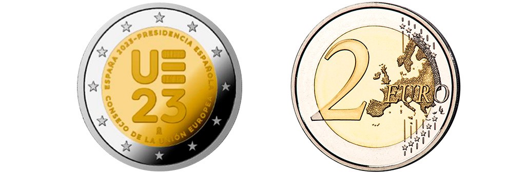 Además de las monedas de uso corriente, la FNMT también produce series limitadas y colecciones para coleccionistas y aficionados a la numismática, convirtiendo cada lanzamiento en un evento esperado con gran anticipación. Por ejemplo, con motivo de la presidencia española de la UE en 2023, la FNMT sacó a circulación una moneda especial de 2€, que puedes ver en la siguiente imagen: