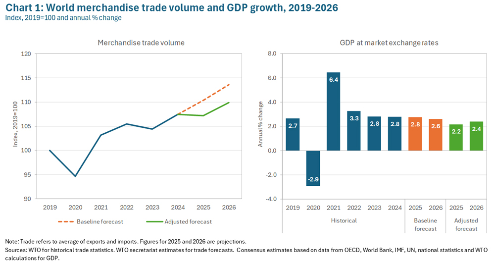 A principios de año, la Secretaría de la OMC esperaba asistir a una expansión del comercio mundial en 2025 y 2026, con un crecimiento del comercio de mercancías acorde con el del PIB mundial y un crecimiento más intenso del comercio de servicios comerciales. Sin embargo, el gran número de aranceles nuevos introducidos desde enero llevó a los economistas de la OMC a reevaluar la situación del comercio, lo que resultó en una reducción sustancial de sus previsiones para el comercio de mercancías y una reducción menor de las relativas al comercio de servicios.