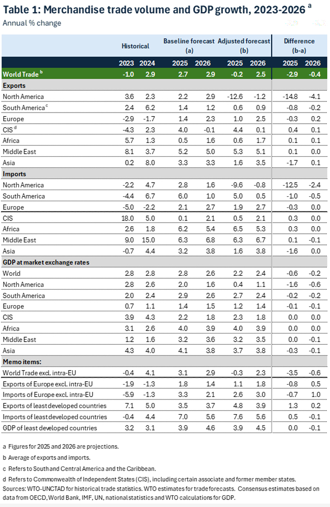 - En las condiciones actuales, es probable que el volumen del comercio mundial de mercancías disminuya un 0,2% en 2025. Se prevé que la disminución sea particularmente acusada en América del Norte, donde se pronostica que las exportaciones caigan un 12,6%.