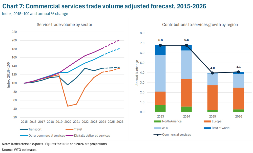 - El informe contiene, por primera vez, una previsión del comercio de servicios, que complementa sus proyecciones relativas al comercio de mercancías. Se prevé que el volumen del comercio de servicios crezca un 4.0% en 2025, alrededor de 1 punto porcentual menos de lo previsto.