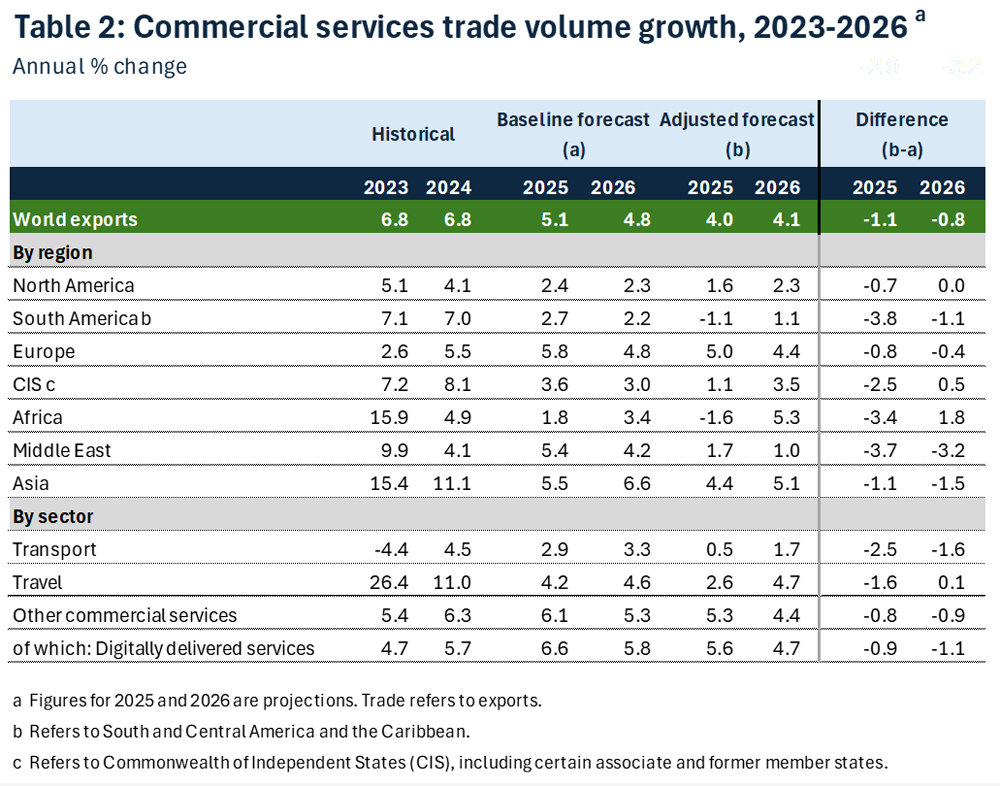 La mayor parte del crecimiento de los servicios en 2025 procederá de Europa, donde se prevé que las exportaciones aumenten un 5,0% con las políticas actuales. El crecimiento europeo se mantendrá en el 4,4% en 2026. Se prevé que las exportaciones de servicios de las economías asiáticas aumenten un 4,4% en 2025 y un 5,1% en 2026. El crecimiento de las exportaciones de servicios de América del Norte disminuirá hasta el 1,6% en 2025, pero después se acelerará hasta el 2,3% en 2026. En Oriente Medio, se prevé que las exportaciones de servicios crezcan el 1,7% en 2025 y el 1,0% en 2026. En la Comunidad de Estados Independientes (CEI), se prevé un crecimiento del 1,1% en 2025 y del 3,5% en 2026. Las perspectivas para África y para América del Sur, Centroamérica y el Caribe en 2025 son desfavorables, y se prevé que se registren descensos en ambas regiones en 2025.