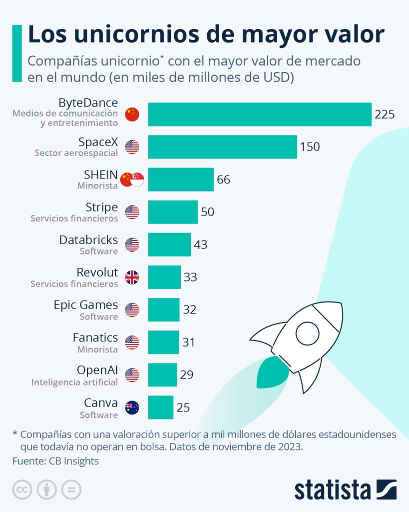 Una firma de origen chino lidera el ranking de las empresas unicornio con mayor valor de mercado del mundo. Según datos de noviembre de 2023 de la consultora CB Insights, la compañía de este tipo que actualmente lidera la clasificación global es ByteDance, la dueña de TikTok, valorada en 225.000 millones de dólares estadounidenses. En segundo lugar, le sigue la empresa estadounidense de fabricación aeroespacial SpaceX, cuyo valor se estima en 150.000 millones de dólares.