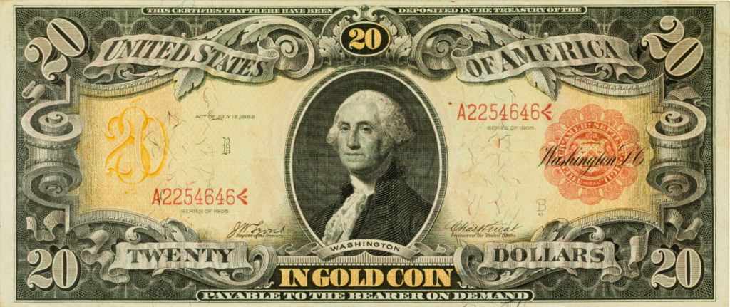 En la primera imagen tenemos un certificado de oro en el que se indica que ese documento es un título oficial (como una especie de escritura o un cheque) que otorga a su poseedor el derecho de recibir a demanda (payable to the bearer on demand) la cantidad de 20 dólares en monedas de oro (in gold coin).