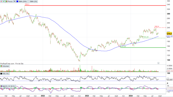 La tendencia de largo plazo es alcista, con el objetivo en sus máximos históricos, por encima de los 300. A corto plazo, corrigió tras presentar sus resultados trimestrales y podría haber formado una resistencia en la zona de 240. La superación de este nivel sería una señal positiva. Muestra soportes de corto plazo en la media de 200 sesiones (línea azul) y en la zona de 195.