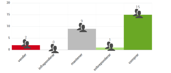 Según el consenso de analistas que recoge FactSet, el precio objetivo promedio se sitúa en 243 EUR, lo que supondría un potencial de revalorización cercano al 13%. Las opiniones de los analistas que publica FactSet se distribuyen de la siguiente forma: