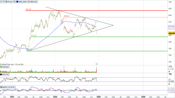 Adobe lleva varios meses cotizando lateralmente. Formó un triángulo simétrico que rompió (con un volumen muy elevado) por su extremo inferior tras la presentación de resultados. Esta ruptura podría anticipar nuevas caídas, por lo que una opción para los inversores que quieran abrir posiciones alcistas, aprovechando las caídas, sería esperar hasta ver indicios de formación de suelo.