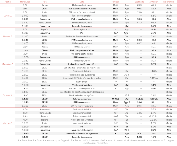 El comienzo de la semana estará marcado por la ausencia de publicaciones de datos macroeconómicos relevantes, ya que habrá que esperar al martes 2, para conocer la lectura del PMI y del ISM manufacturero de agosto. En este sentido, el consenso del mercado prevé que alcancen 53,3 y 48,7 puntos, respectivamente. Por su parte, el miércoles serán relevantes la evolución de los pedidos de fábrica en julio, así como la encuesta JOLTS de ofertas de empleo de julio. Paralelamente, se publicarán los datos de pedidos de bienes duraderos y las solicitudes semanales de hipotecas.