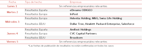 En el ámbito empresarial, destacarán la presentación de resultados de eDreams ODIGEO, InPost, Helvetia Holding, M&G, Swiss Life Holding, AmRest Holdings y CVC Capital Partners, entre otros.