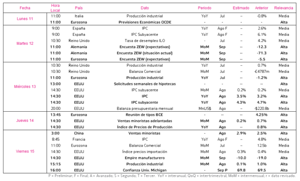Por su parte, en EEUU, el miércoles 13 se conocerá el dato de agosto de la tasa de variación del IPC general y subyacente, tras situarse en julio en un 3,2% y un 4,7% interanual, respectivamente. Todo ello en un contexto en el que en el pasado simposio de Jackson Hole, el presidente de la Fed, Jerome Powell, declarase que la inflación continúa siendo demasiado elevada para situarse en el objetivo de un 2% anual.