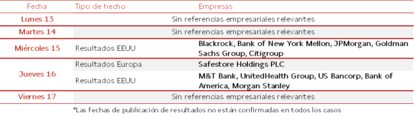 En el plano empresarial, destacará la publicación de resultados empresariales de diversas entidades financieras como JPMorgan, Goldman Sachs, BlackRock, Morgan Stanley, entre otros.