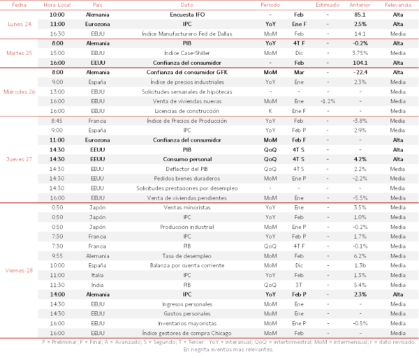 En el ecuador de la semana, será relevante la publicación de la confianza del consumidor GFK de marzo en Alemania y el índice de precios industriales de España de enero. El jueves 27, será protagonista la publicación del IPP de Francia de febrero y la lectura preliminar de febrero del IPC de España. Adicionalmente, se publicará el dato final de la confianza del consumidor de la Eurozona de febrero.