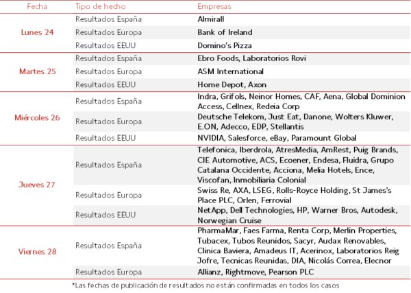 En el ámbito empresarial, destacará la publicación de resultados empresariales de compañías como NVIDIA, HP, Axon y Warner Bros entre otros.