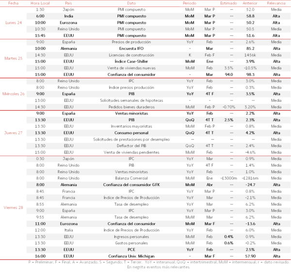 El comienzo de la semana destacará por la publicación de la lectura preliminar del PMI compuesto tanto de la Eurozona como de Reino Unido de marzo. Por su parte, el martes 25, se dará a conocer la evolución del índice de precios de producción de febrero en España, que registró un incremento de un 2,6% interanual en enero, y la encuesta IFO de Alemania en marzo. En el ecuador de la semana, tendrá lugar la publicación de la lectura final del PIB de España en el 4T y del conjunto de 2024. Por su parte, en Reino Unido destacará los datos del IPC de febrero, tras situarse la tasa de inflación general en enero en un 3,0% interanual. El jueves 27, será protagonista la publicación de las ventas minoristas de febrero en España.