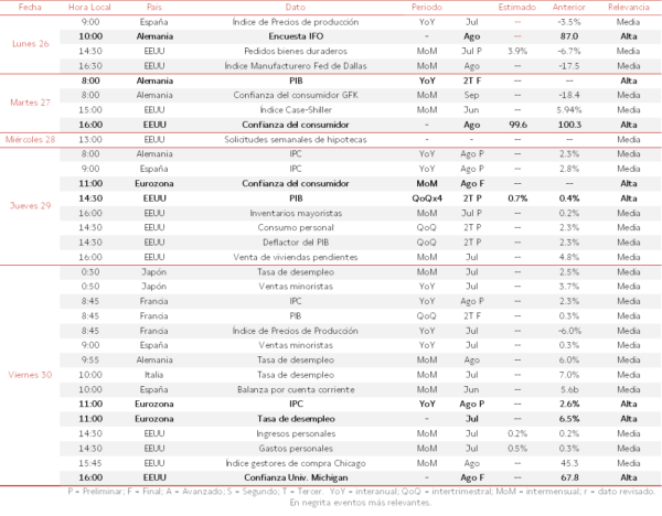 El comienzo de semana destacará por la publicación del índice de precios de producción de nuestro país correspondiente al mes de julio. Por su parte, conoceremos la encuesta Ifo de Alemania de agosto, clave para determinar las perspectivas de actividad de la principal economía de la Eurozona en los próximos meses.  El martes 27, la atención se centrará en la lectura final del PIB de Alemania del 2T de 2024. Adicionalmente, se publicará la confianza del consumidor GFK del mes de septiembre, registrando en agosto una ligera mejora del clima de consumo hasta -18,4 puntos (vs. -21,6 puntos en julio). No será hasta el jueves 29, cuando conoceremos la lectura preliminar del IPC de agosto tanto de España como de Alemania, en una jornada en la que también destacará el dato definitivo del índice de sentimiento económico (ESI) del sector privado de la Eurozona del mes de agosto.