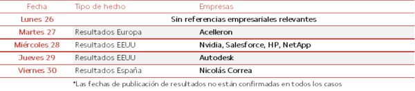 En el ámbito empresarial, destacará por la publicación de resultados de compañías como Nvidia, Salesforce, HP, NetApp y Autodesk, entre otros.