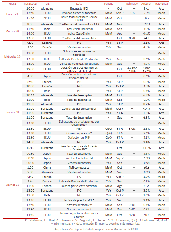 Respecto a las referencias macroeconómicas de instituciones privadas y otros organismos, el martes 28 destacará la tendencia del índice de confianza del consumidor del Conference Board de octubre (vs. 94,2 puntos en septiembre). Paralelamente, el miércoles 29 la atención se centrará en la decisión de tipos de interés oficiales de la Fed, que previsiblemente rebaje en 25 pb los tipos interés oficiales ante la debilidad del mercado laboral estadounidense. Al final de la semana se conocerá el índice de gestores de compra de Chicago de octubre (vs. 42,0 puntos en septiembre).