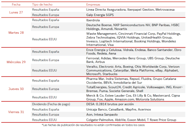 En el ámbito empresarial, destacará la publicación de resultados de Línea Directa Aseguradora, Iberdrola, BNP Paribas, Amundi, Endesa, Banco Santander, Ferrovial Deutsche Bank y Airbus, entre otros. Además, será relevante el pago de dividendos de DESA, entre otros.