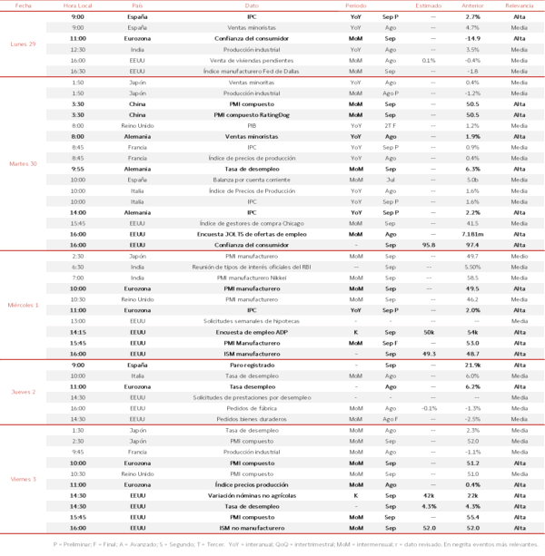 En el arranque de la semana destacará la publicación del índice manufacturero de la Fed de Dallas del mes de septiembre (vs. -1,8% en agosto). Al día siguiente, la atención se centrará en la tendencia del índice de confianza del consumidor del Conference Board de septiembre (vs. 97,4 puntos en agosto), marcada por la creciente incertidumbre de los hogares estadounidenses sobre la estabilidad del mercado laboral. Paralelamente, se conocerá la encuesta JOLTs de ofertas de empleo del mes de agosto (vs. 7.181.000 en julio).