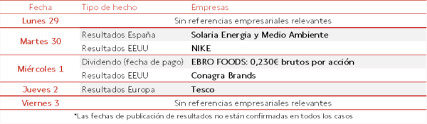 En el ámbito empresarial, destaca la presentación de resultados de Solaria Energia y Medio Ambiente y Tesco, entre otros. Además, destacará el reparto de dividendos de EBRO FOODS.