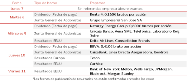 En el ámbito empresarial, destacarán los resultados de Tesco, entre otros, así como el pago de dividendos de Renta 4, Naturgy Energy Group y BBVA. A su vez, tendrá lugar la junta general de accionistas de Unicaja Banco, Aena SME, Telefónica, CaixaBank e Iberdrola, entre otros.