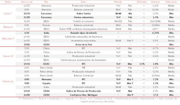 El miércoles, como todas las semanas, se publicarán las solicitudes semanales de hipotecas. Adicionalmente, serán importantes las referencias de los inventarios mayoristas y las actas de la Fed. Por su parte, el jueves 10 destacará el dato del IPC de marzo, estimándose que se modere hasta un 2,5% interanual, y la publicación de las solicitudes por prestaciones de desempleo.