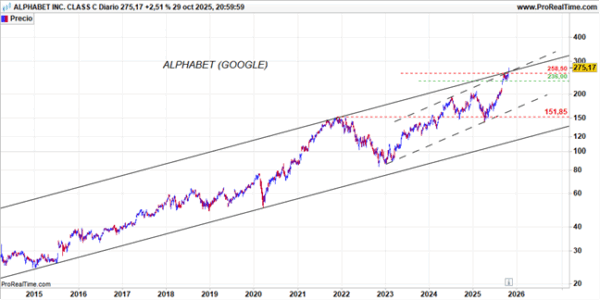 Se encuentra en una tendencia alcista de largo plazo. La ruptura de los techos de los canales alcistas de corto y largo plazo es en principio una señal de continuidad alcista sin referencias de posibles resistencias. Las líneas recién superadas podrían ejercer en los próximos meses de niveles de niveles de soporte convirtiéndose en la base de un canal alcista paralelo superior. Por el contrario, la eventual ruptura de la zona de 268$ sería señal de una corrección de corto plazo.