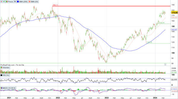 Se encuentra en tendencia alcista de largo plazo, con un próximo objetivo en los máximos de 188,11. La tendencia de corto plazo es también alcista, con resistencia en la misma zona. Tiene un primer soporte en 154,81, una eventual corrección de corto plazo debería hacer suelo en esa zona.