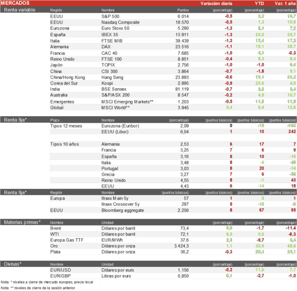 - En España, la sesión ha cerrado de forma negativa, aunque destacó el buen comportamiento de Indra (+1,7 %) y de las utilities, que actúan como valores refugio ante la incertidumbre geopolítica. En el lado negativo, IAG se vio afectada por el fuerte aumento del precio del barril de petróleo. Además, las compañías más endeudadas o con negocios dependientes de la financiación, como Grifols, Fluidra, Acciona y el sector financiero, sufrieron caídas debido al repunte en las rentabilidades de los bonos europeos.