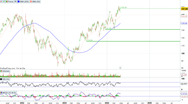 En el gráfico se muestra la cotización de las acciones de la clase C (GOOG). El valor se encuentra en tendencia alcista de corto, medio y largo plazo. Como anticipa la cotización en after hours, hoy hará nuevos máximos históricos, por lo que se encuentra en subida libre, sin resistencias. La verticalidad de la subida nos deja sin soportes cercanos, si bien la zona de cierre del hueco que dejará hoy (zona de 158) podría funcionar como soporte.