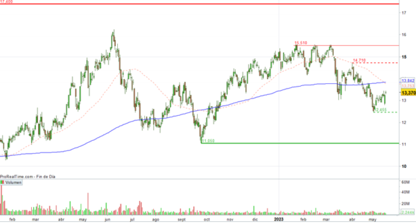 A largo plazo, situaríamos un objetivo alcista en la zona de 17,40 (máximos de octubre de 2018). A corto plazo la tendencia es bajista, tras completar un triple techo en el mes de marzo. En estos momentos intenta rebotar desde los 12,46, su situación técnica mejoraría de superar la media de 200 sesiones y los 14,71.