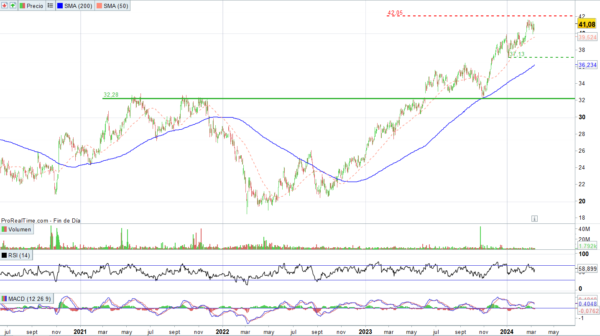 Inditex está en tendencia alcista de corto, medio y largo plazo. Tras la presentación de resultados, está superando el objetivo de 42 € que habíamos marcado previamente y llegando a nuevos máximos históricos.
