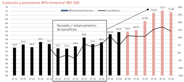 Según las estimaciones, en EEUU seguirá mostrando una clara aceleración del crecimiento de los beneficios, a tasas superiores al 10% interanual. Las previsiones de consenso proyectan un ciclo de crecimiento intenso en los dos próximos años en el que el beneficio por acción (BPA) del S&P 500 podría crecer a tasas cercanas al 14% anual.
