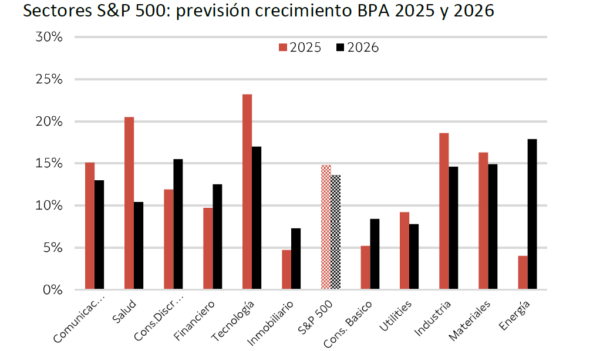 A nivel sectorial se prevé que el mayor crecimiento del BPA en el 4T lo registrará el sector financiero (+36%) aunque en parte por efectos extraordinarios. Además se espera que los sectores que integran a las “7 magníficas”, Utilities y Salud registren crecimientos del BPA superiores al 10%. Por el contrario, Energía, Materiales, Industria y Consumo básico van a mantener, a priori, crecimientos negativos. Las previsiones para 2025 y 2026 proyectan sólidos crecimientos en todos los sectores, liderados por Salud y Tecnología en 2025