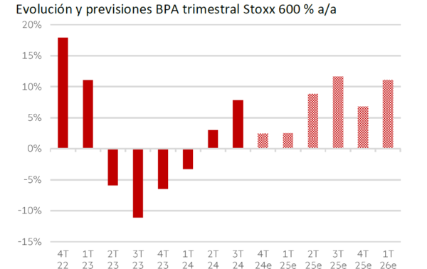 En Europa, para el Stoxx 600 se proyecta una desaceleración del crecimiento del BPA en el 4T al 2,4% respecto al 7,8% del 3T. Se mantiene una elevada dispersión entre sectores con Industria (+20%) y Salud (+10%) a la cabeza, mientras Consumo cíclico (-25%) registra una fuerte contracciónpor las compañías de lujo y automoción fundamentalmente. Se espera que el crecimiento se mantenga débil en el 1T, para acelerarse en los trimestres siguientes a tasas de en torno al 10% anual.
