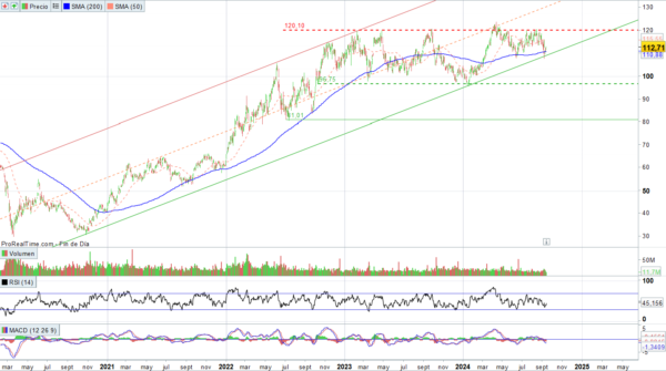 A largo plazo, cotiza dentro de un canal alcista. Dentro de dicho canal, se ha movido en un rango lateral desde principios de 2023, entre 96 y 120 aproximadamente. En los últimos días, la base del canal y la media de 200 sesiones han funcionado como soportes en la caída de la cotización, por lo que podríamos fijar un primer objetivo alcista en la zona de 120, donde hay una resistencia.