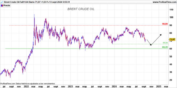 Si nos fijamos en el gráfico del petróleo (Brent Crude Oil), la semana pasada continuó con su corrección, acercándose a su zona de soporte más importante en la banda entre 60$ y 65$. Creemos que esto aumenta la probabilidad de formación de un suelo por encima de esos niveles.