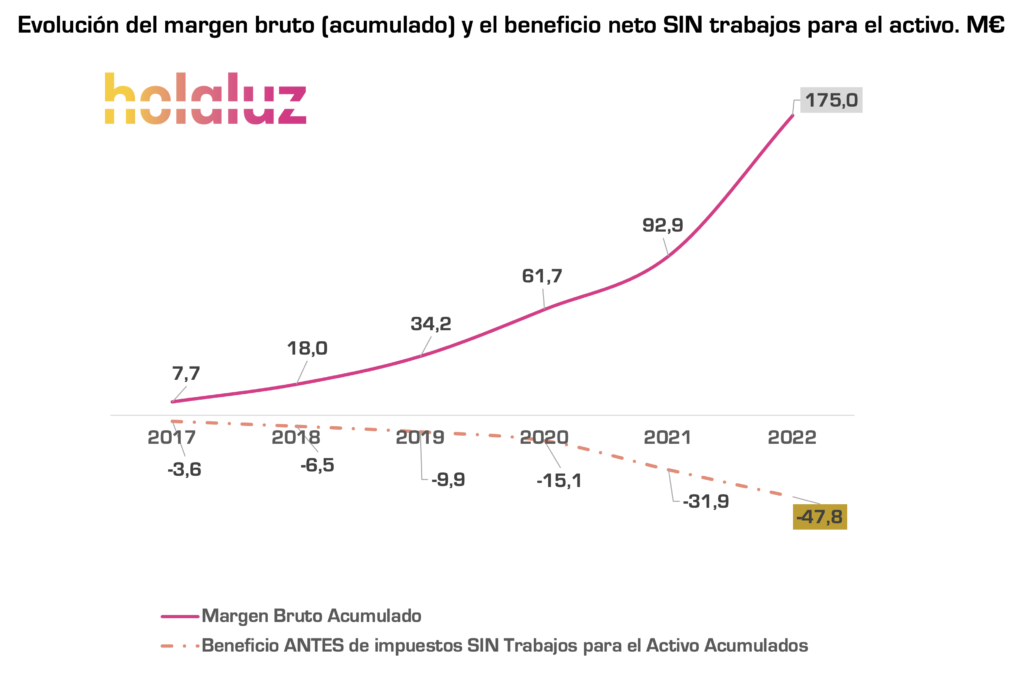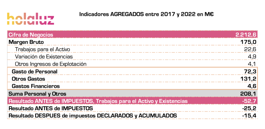 La conclusión es que desde 2017 hasta 2022, Holaluz declaró que en todo el período perdió 15,4 M€. Pero si usáramos el modelo más ‘anglosajón’ de presentar las cuentas (quitando aspectos como los trabajos para el activo y las variaciones de existencias), las perdidas reales hasta el momento superan los 52 M€.