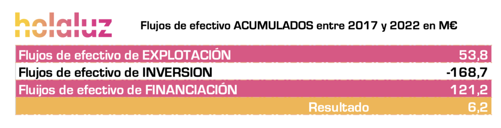 Como se puede observar, todos los flujos puros del negocio (entradas de efectivo por la diferencia entre ingresos cobrados y gastos pagados), generó casi 54 M€ desde 2017 a 2022.