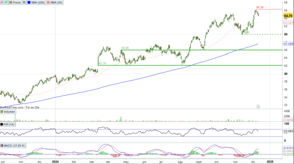 La caída de hoy le ha acercado a su soporte de corto plazo de 50,00, por lo que de momento deja intacta la tendencia alcista. La eventual pérdida de ese nivel podría favorecer una fase de corrección más importante hacia su zona de soporte estructural de largo plazo en la banda 42,00-46,00.