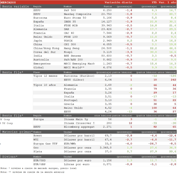 - Los principales índices europeos finalizan la semana con una sesión netamente bajista por el temor a que los aranceles acordados vayan a afectar a los beneficios empresariales en los próximos trimestres. El Stoxx 600 ha registrado hoy la mayor caída en un día y en una semana desde comienzos de abril, pese al optimismo con que se inició la semana tras el acuerdo firmado el domingo pasado. La sesión se inició con descensos más acusados en los sectores expuestos a los aranceles, pero fue girando hacia un sesgo claramente defensivo con los mayores recortes en los sectores cíclicos y cierta resiliencia en los defensivos. Hoy ha destacado el CAC 40 francés con un recorte de un 2,9%. Por su parte, el Euro Stoxx 50 ha perdido un 2,9% y el IBEX 35 un 1,9%, donde las tomas de beneficios en los valores bancarios se han compensado en parte por el tono más resiliente de las utilities.