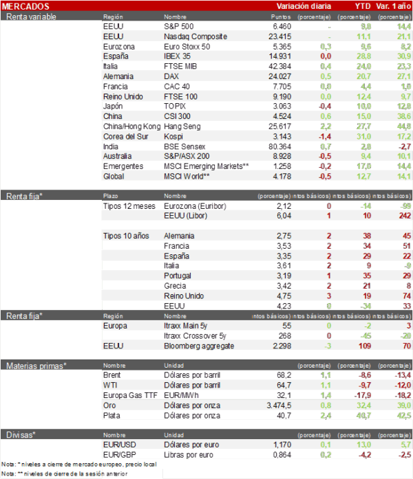 - En España, el Ibex se ha tomado un descanso, en una sesión con escasos movimientos donde destacamos las subidas de IAG (+2,9 %) y Rovi (+1,9 %), mientras que el lado negativo lo ha puesto Solaria (- 4,1%) impactado por la caída del sector de renovables tras los recortes en financiación de EE. UU. y Amadeus (–3,5 %) tras un descenso en el precio objetivo de Goldman Sachs debido a la incertidumbre macroeconómica en la demanda de viajes, a pesar de que el banco americano continúa recomendando comprar.