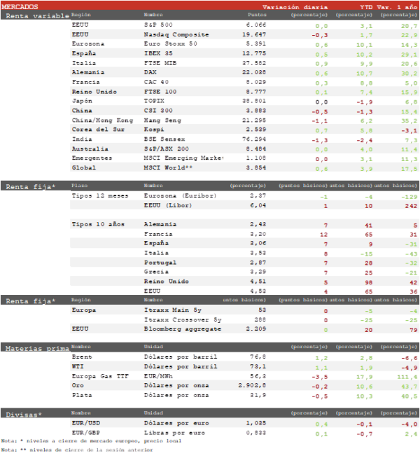 - Las bolsas europeas continúan la racha alcista con índices como el Stoxx 600, DAX o FTSE 100 marcando nuevos máximos históricos, mientras el IBEX 35 y el FTSEMIB italiano registran máximos desde 2008. Tecnología y Energía lideran los avances, mientras Utilities y Materiales, dos sectores sensibles a las medidas arancelarias de Trump registran los mayores retrocesos. Hoy ha destacado el FTSEMIB italiano con un repunte de un 0,9%. Por su parte el Euro Stoxx 50 ha repuntado un 0,6%, situándose a menos de un 2% de sus máximos históricos del año 2.000.